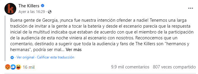 El grupo estadounidense de rock The Killers se disculpó este miércoles por haber invitado a un fan ruso a subir al escenario durante un concierto en Georgia, lo que provocó abucheos por parte del público, dada la complicada relación que mantiene el país con Moscú.