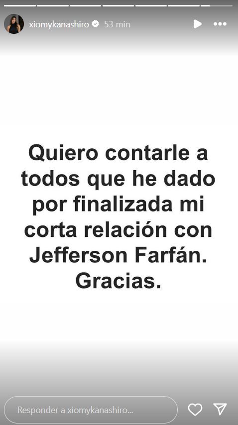 La modelo Xiomy Kanashiro captó la atención de sus seguidores luego que en su storie de Instagram compartiera un corto, pero contundente mensaje en el que anunció que su romance con el exfutbolista Jefferson Farfán llegó a su fin.
