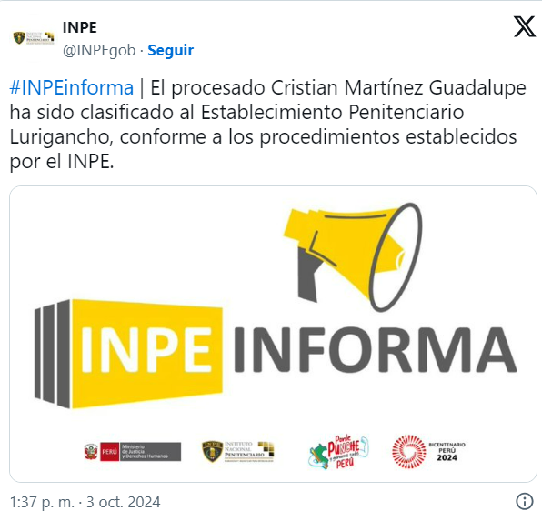El Instituto Nacional Penitenciario (INPE) informó que el investigado fue clasificado al Establecimiento Penitenciario Lurigancho, donde cumplirá el tiempo en prisión que le impuso el Poder Judicial.