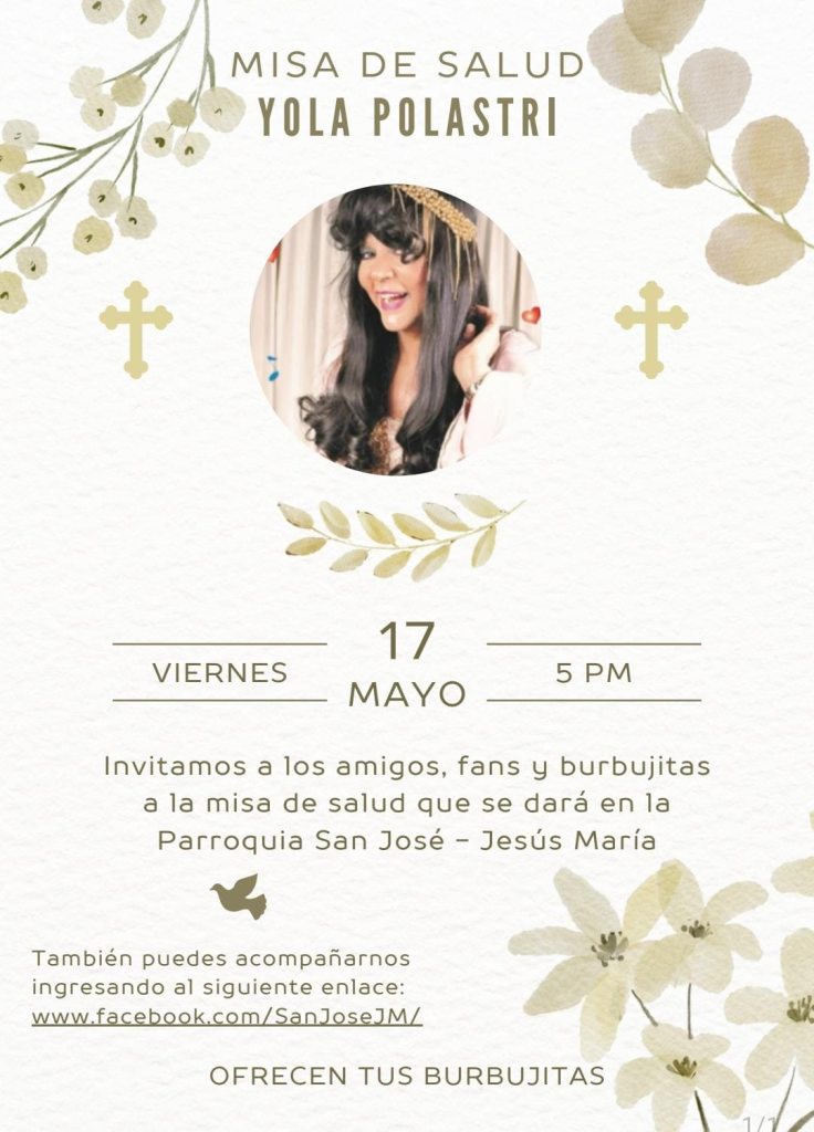 “Invitamos a los amigos, fans y burbujitas a la misa de salud que se dará en la Parroquia San José – Jesús María”, se lee en la invitación. Además, para las personas que no puedan asistir a la eucaristía, podrán verlo a través de la página de Facebook de la iglesia.