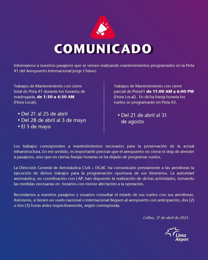 “Informamos a nuestros pasajeros que se vienen realizando mantenimientos programados en la Pista #1 durante los horarios de madrugada, de 1:30 a 4:30 AM (hora local), del 21 al 25 de abril, del 28 de abril al 3 de mayo y el 5 de mayo”, se lee en el comunicado oficial.