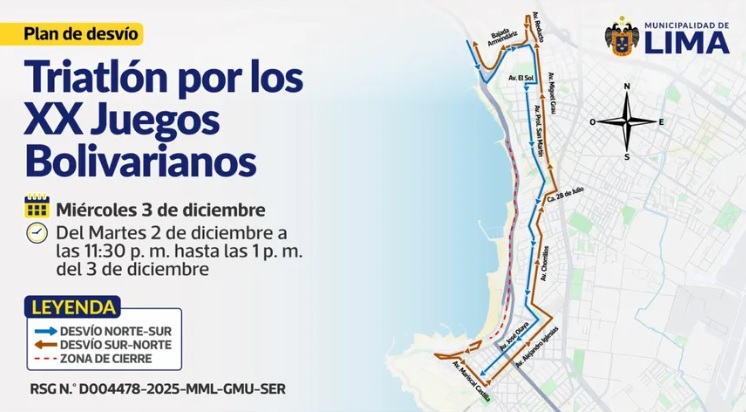 Y es que este miércoles se desarrollará la triatlón por lo que las vías de la Costa Verde estarán cerradas desde las 11 de la noche del martes 2 de diciembre hasta la 1 de la tarde del miércoles 3 de diciembre. Cabe mencionar que el cierre de la vía será mayor al último se realizó la semana anterior.