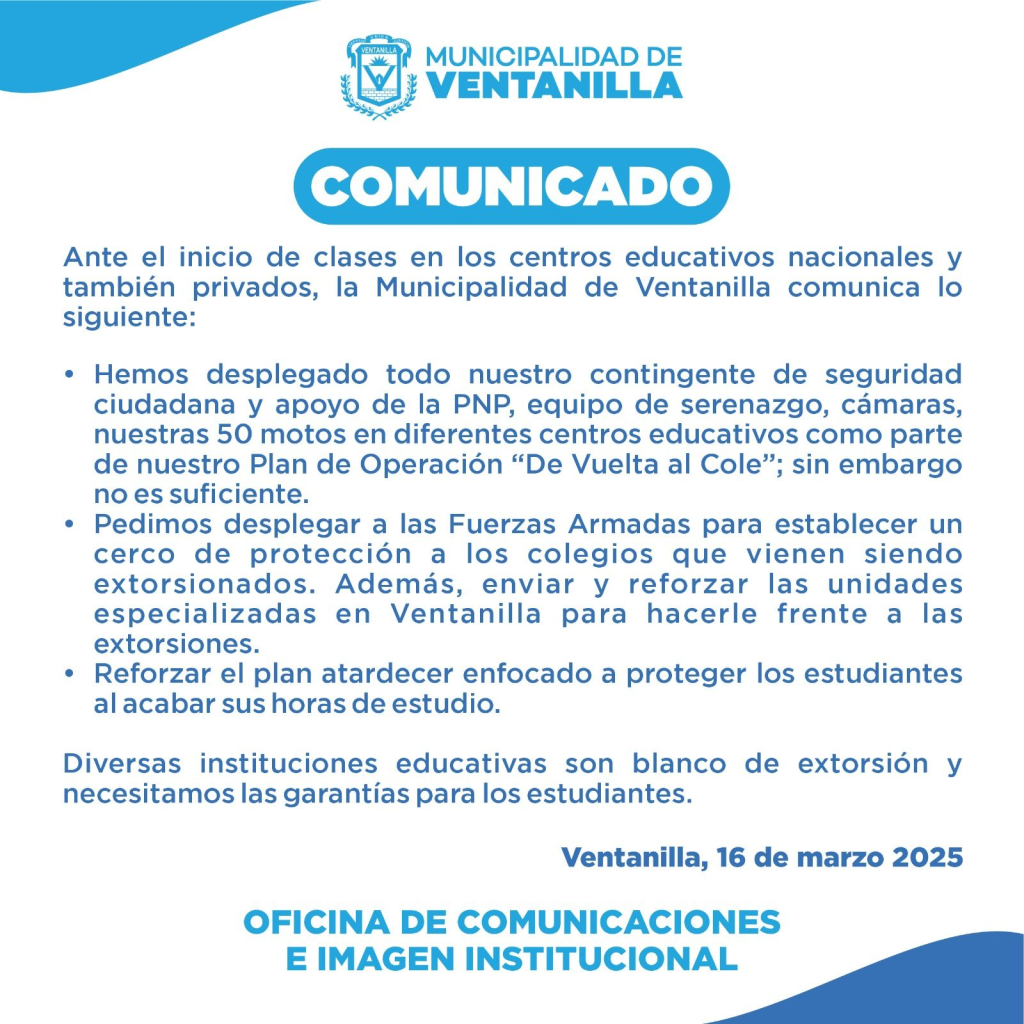 “Pedimos desplegar a las Fuerzas Armadas para establecer un cerco de protección a los colegios que vienen siendo extorsionados. Además, enviar y reforzar las unidades especializadas en Ventanilla para hacerle frente a las extorsiones”, es la solicutd que hace el municipio de Ventanilla a través de un comunicado en su cuenta oficial de Facebook.
