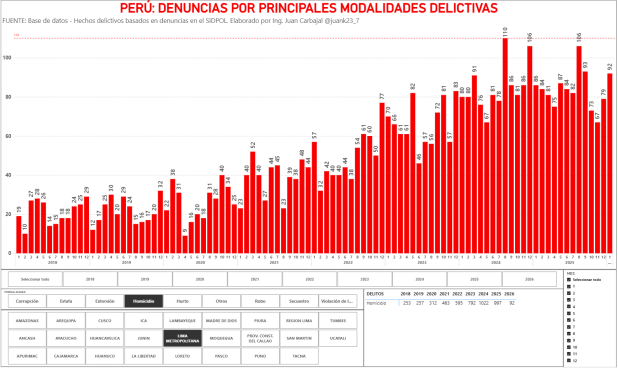 Según el cuadro organizado por el analista de datos, Juan Carbajal, en enero de 2026, se han registrado 92 homicidios, siendo el más alto, a comparación de enero de 2025, que registró 86 asesinatos.