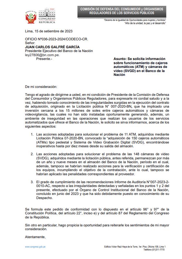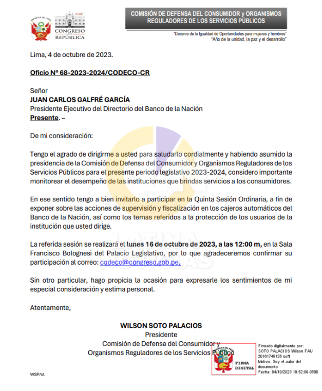 El congresista Wilson Soto envió una carta al presidente del Banco de la Nación, Juan Carlos Galfré García, en la que lo invita a participar en la Quinta Sesión Ordinaria de la Comisión de Defensa del Consumidor y Organismos Reguladores de los Servicios Públicos con la finalidad de exponer sobre las acciones de supervisión y fiscalización en los cajeros automáticos, así como los temas referidos a la protección de los usuarios de la institución.