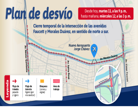 Además, los autos ligeros que se desplacen por Morales Duárez hacia Faucett podrán emplear la vía auxiliar para seguir con su trayecto. Para el transporte de carga, se deberá seguir empleando las avenidas Néstor Gambetta y Argentina.