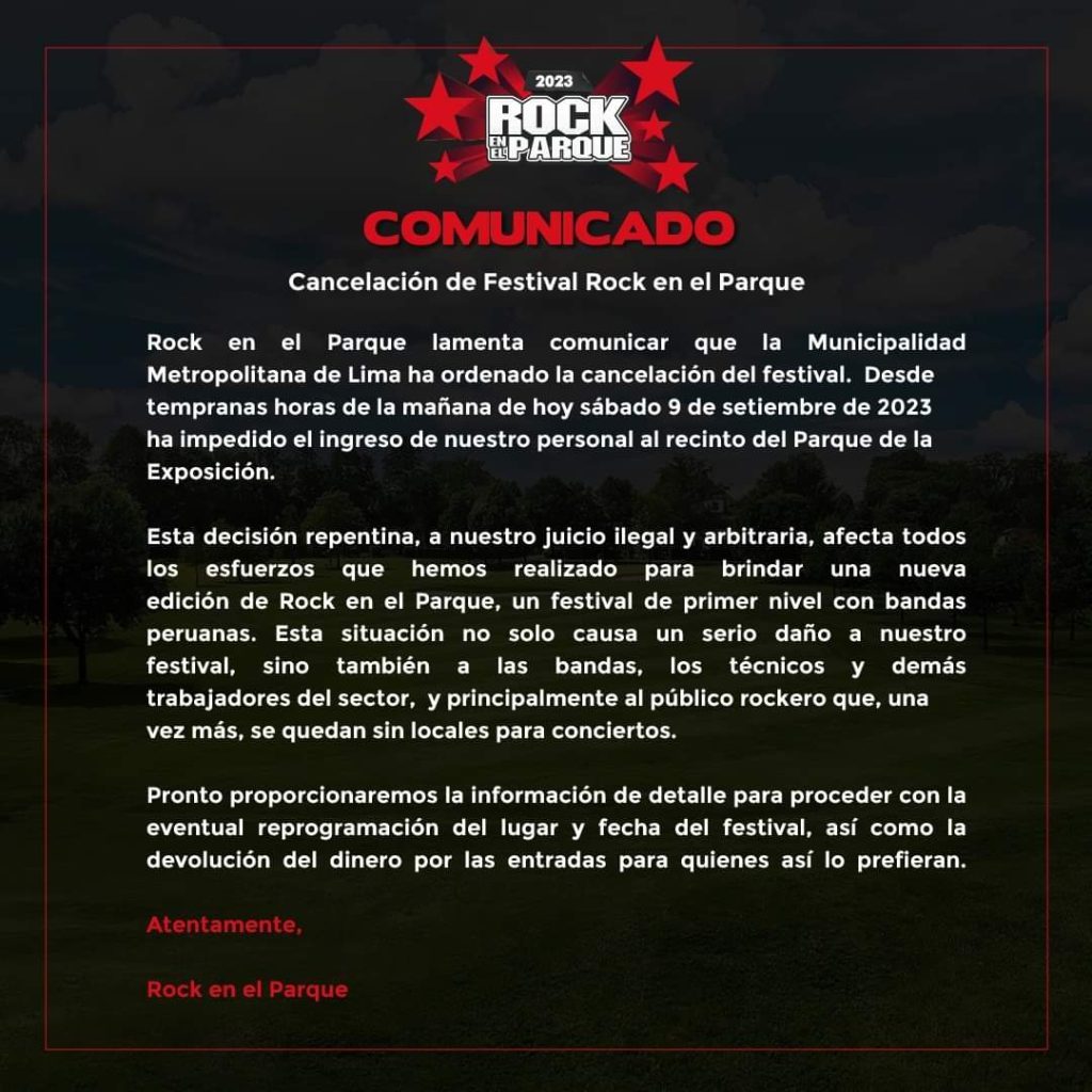 De acuerdo con el documento, la cancelación del Festival de Rock afecta directamente a los esfuerzos realizados por los organizadores del evento, quienes tenían como objetivo reunir a múltiples bandas peruanas.