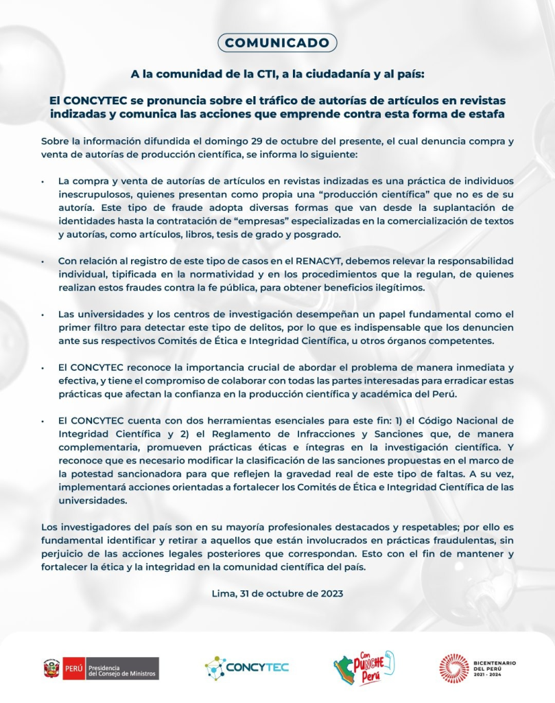 Por otra parte, Concytec señaló que implementará acciones orientadas a fortalecer los Comités de Ética e Integridad Científica de las universidades. Reconoce, también, la importancia crucial de abordar el problema de manera inmediata y efectiva, y tiene el compromiso de colaborar con todas las partes interesadas para acabar con las prácticas que vulneren a la comunidad científica y académica del Perú.