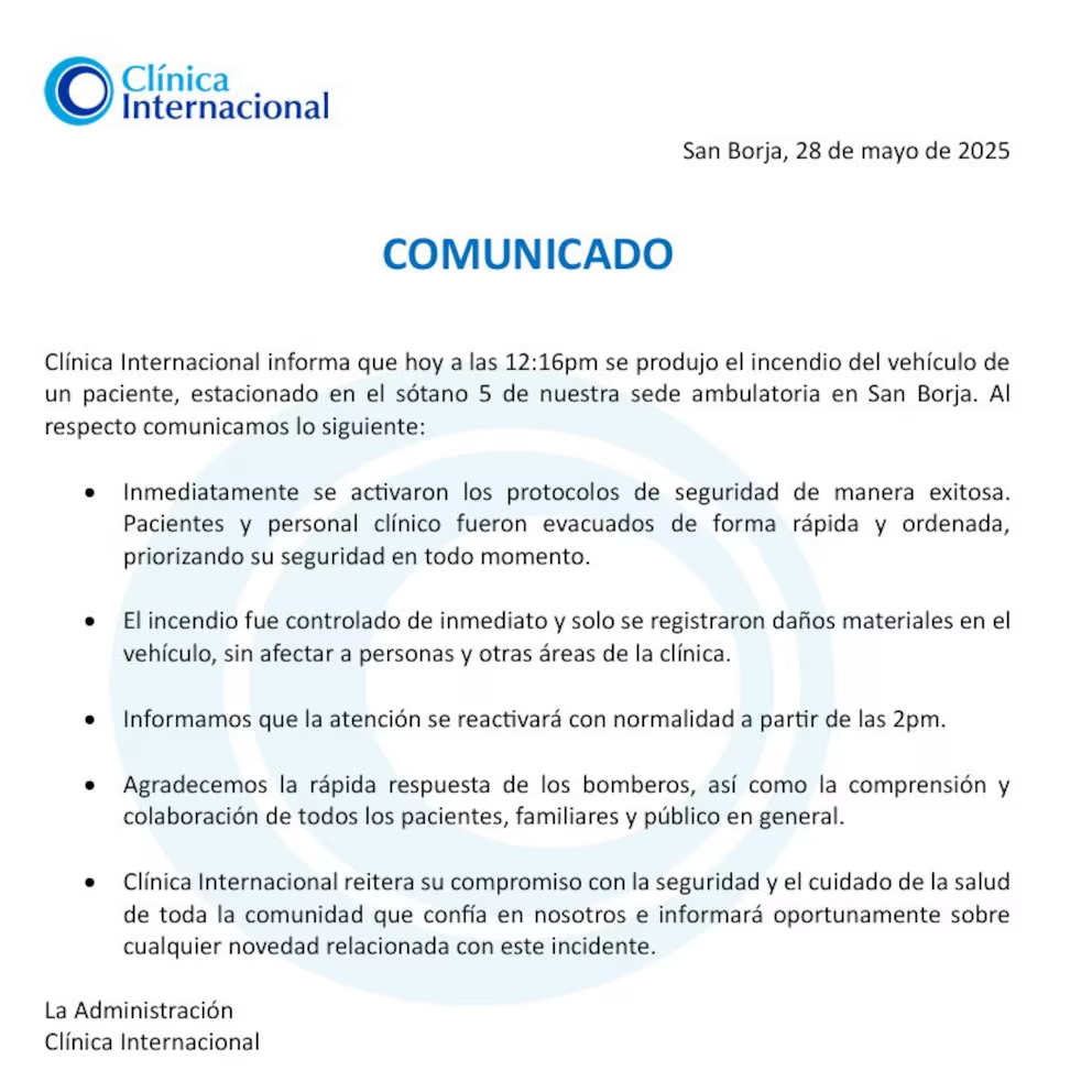 Tras el incidente, la clínica Internacional se pronunció al respecto y envió un comunicado en sus cuentas oficiales en donde explican lo que sucedió esta mañana en su sede de San Borja. El centro médico especificó que el incendio se produjo en el sótano 5 a las 12:16 de la tarde.