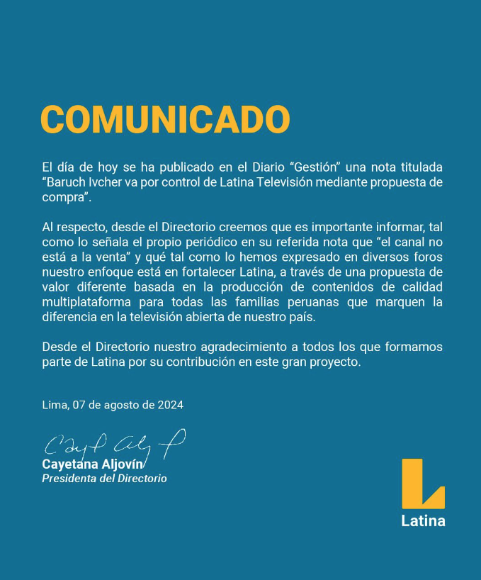 Este miércoles 7 de agosto, Latina Televisión lanzó un comunicado a través de sus redes sociales en el que aclaró la información difundida por el diario Gestión sobre la compra del canal por Baruch Ivcher.