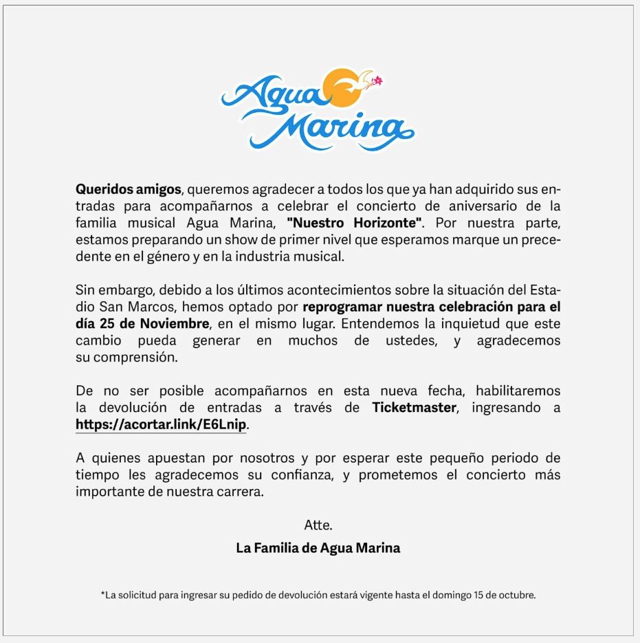 El grupo musical, originario de Sechura (Piura) confirmó cambios en la fecha de su presentación. Las personas que no puedan asistir para el nuevo día de reprogramación, deberán solicitar la devolución de sus entradas en Ticketmaster (https://acortar.link/E6Lnip).