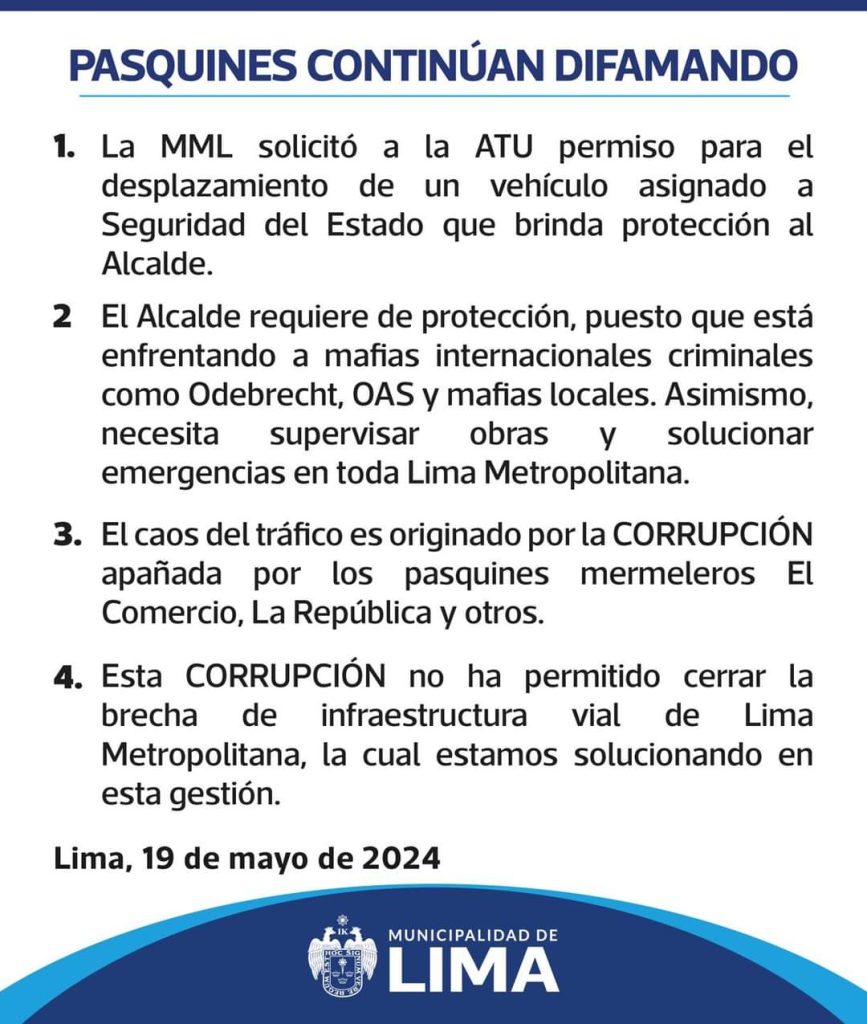 “Nuestras organizaciones llaman la atención del alcalde de Lima respecto a la tolerancia que debe tener una autoridad pública con todos los medios de comunicación, así no sean de su agrado porque lo critican o fiscalizan su gestión”, se detalla.