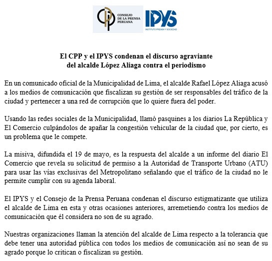 Luego de que el alcalde de Lima, Rafael López Aliaga, acusara a los medios de ser responsables del tráfico en la capital, el Instituto de Prensa y Sociedad (IPYS) y el Consejo de la Prensa Peruana se pronunciaron al respecto.