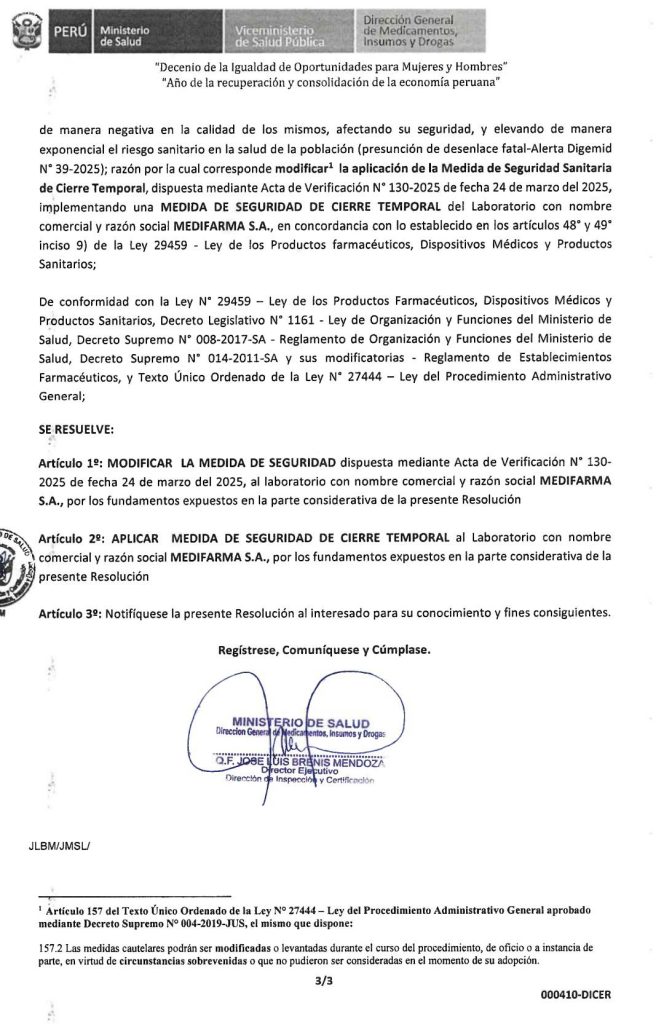 El Ministerio de Salud (Minsa), a través de la Dirección General de Medicamentos, Insumos y Drogas (Digemid), ordenó el cierre temporal del laboratorio Medifarma tras detectar serias irregularidades en la fabricación del suero fisiológico. La medida se tomó luego de que varios pacientes fallecieran y otros presentaran reacciones adversas tras su uso.