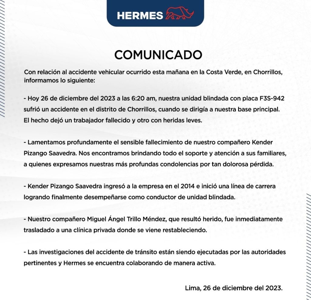 Luego de que la mañana de este martes 26 de diciembre un camión de caudales de la empresa Hermes se volcara a la altura de la playa Agua Dulce, en el distrito de Chorrillos y dejara 1 fallecido, la compañía se pronunció y lamentó la muerte de uno de sus trabajadores.
