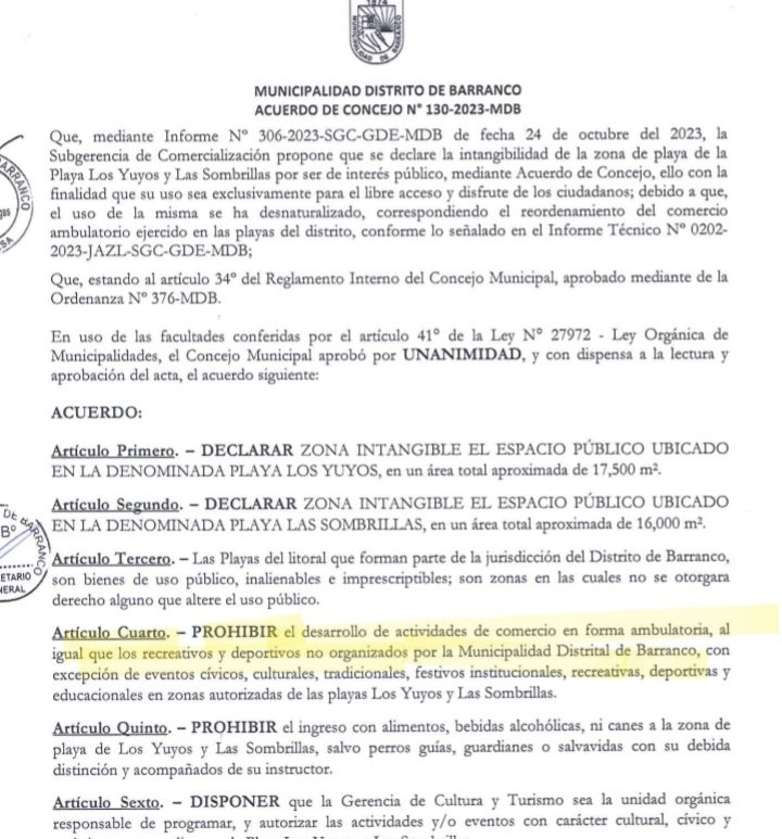 “Prohibir el desarrollo de actividades de comercio en forma ambulatoria, al igual que los recreativos y deportivos no organizados por la Municipalidad Distrital de Barranco, con excepción de eventos cívicos, culturales, tradicionales, festivos institucionales, recreativas, deportivas y educacionales en zonas autorizadas de las playas Los Yuyos y Las Sombrillas.