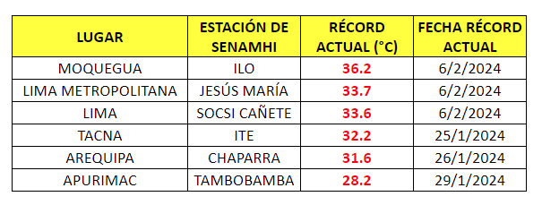 La región Moquegua tuvo el máximo récord de temperatura con sus 36.2° C el martes 06 de febrero, reportados desde la estación de Ilo, superando así, aunque por poco, a sus 36° registrados el 21 de febrero de 2023.
