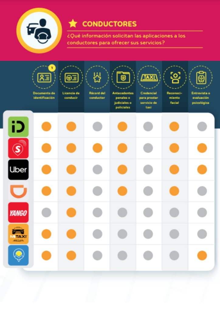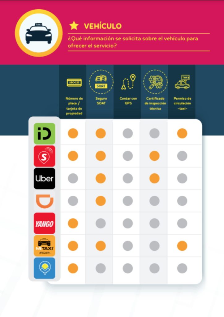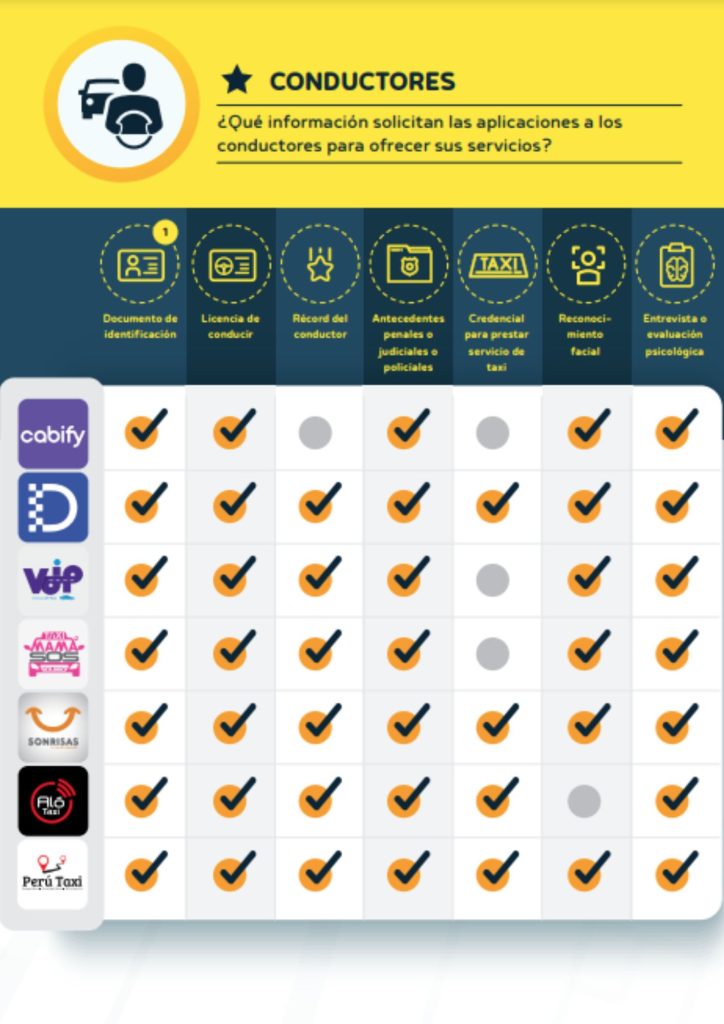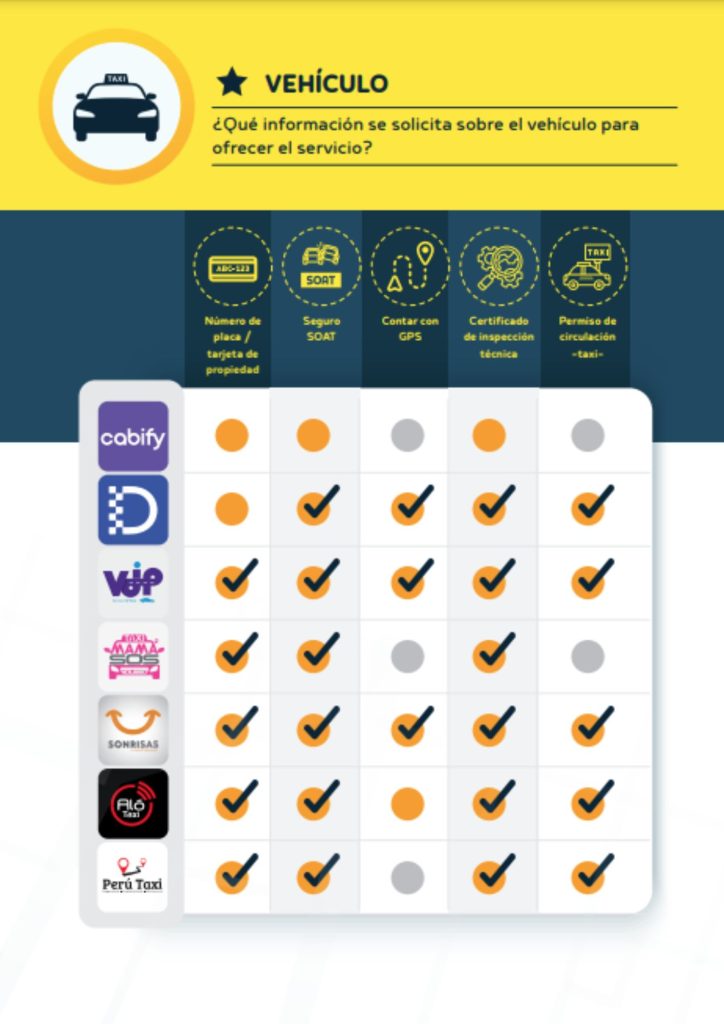 Sin embargo, para Indecopi, Cabify cumple con solicitar número de placa de rodaje, SOAT y certificado de inspección técnica. El organismo no detalló que esta empresa cumpla con solicitar GPS o permiso de circulación de taxi. De igual forma, las empresas, en su totalidad, cumplen con sus filtros en comparación a los aplicativos.