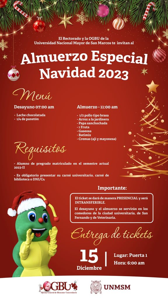 La Universidad Nacional Mayor de San Marcos ha programado este evento para este viernes 15 de diciembre. Para obtener una de estas raciones, los estudiantes deberán hacer cola desde las 6:00 a.m. del viernes 15 para recibir sus tickets en la Puerta 1 del centro de estudios y así acceder al tan esperado almuerzo. El desayuno se servirá desde las 7:00 a.m. y el almuerzo se repartirá desde las 11:00 a.m.
