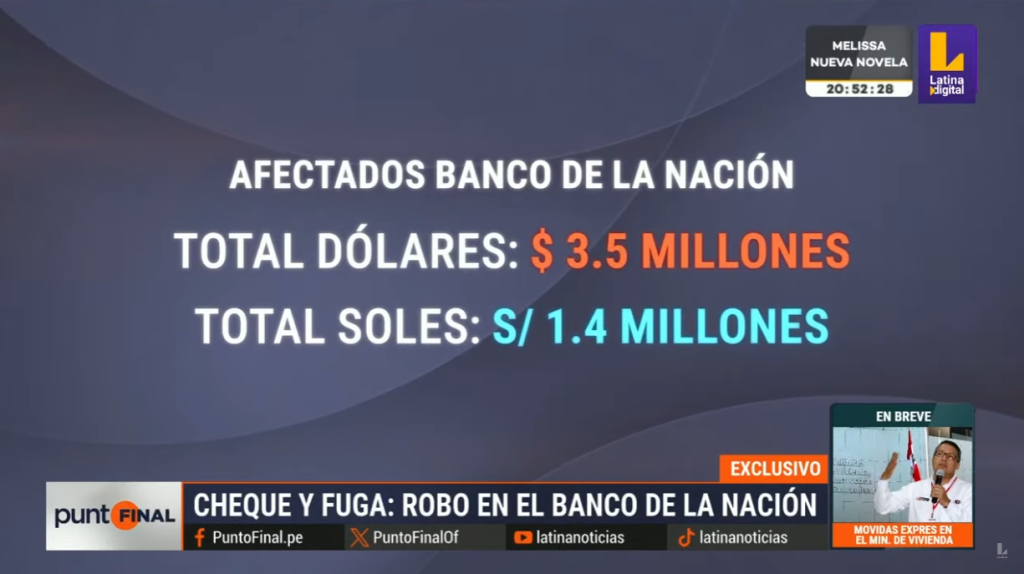 Se han identificado no uno ni dos, sino al menos catorce cheques que suman tres millones y medio de dólares y un millón cuatrocientos mil soles. Los afectados van desde personas naturales hasta instituciones públicas como Osiptel y privadas como la minera Quellaveco. Este plan habría contado también con la complicidad de cinco trabajadores del banco y ocho personas ajenas a la institución quienes cobraron el dinero. Todos bajo el mando de Miguel Ángel Ugaz Díaz, el líder de la organización criminal Los Bancarios.