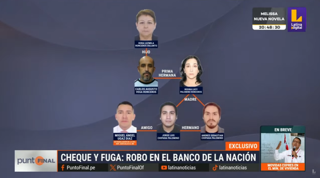 Pero no solo su amigo Jorge Luis Chipana Palomino cobró los cheques del Banco de la Nación, sino que involucró a su hermano Sebastián, a su madre Lucy Palomino, a su tío Carlos Vega Ronceros, y a la madre de este Dora Ronceros Dulanto. Toda una familia presuntamente involucrada como un brazo de la organización criminal.