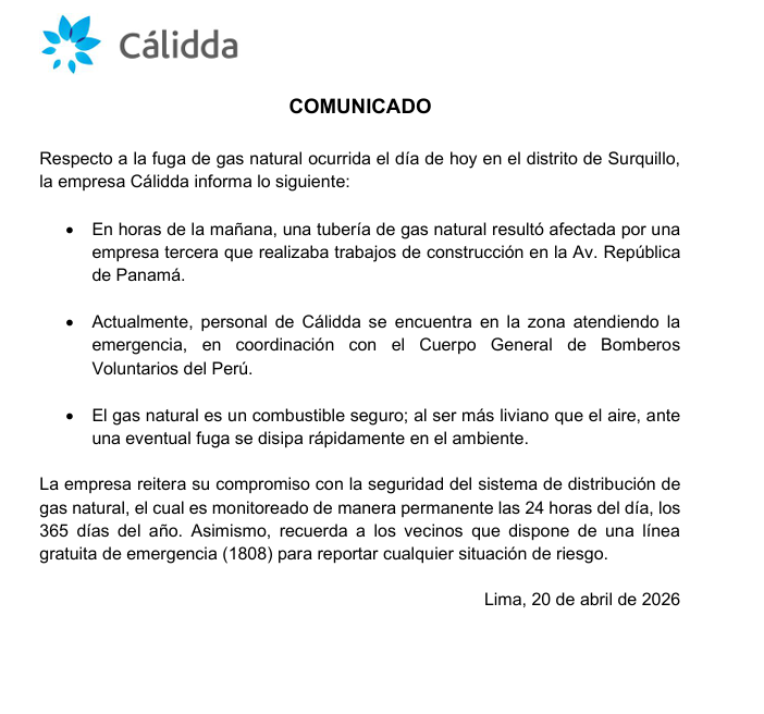 Desde las 9:00 a.m. de este lunes 20 de abril, una fuga de gas natural mantiene en alerta a vecinos y autoridades en el distrito de Surquillo. El incidente se registra a la altura de la cuadra 50 de la avenida Avenida República de Panamá, donde trabajos de una inmobiliaria ocasionaron el daño a una tubería subterránea.