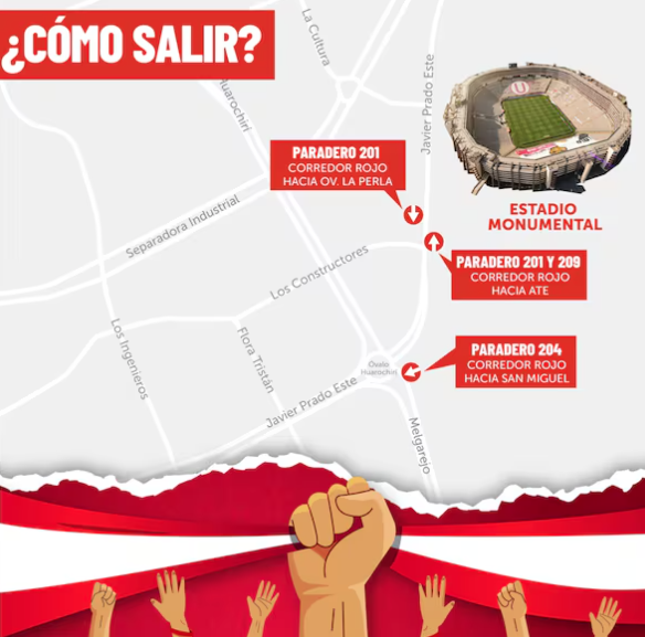 Los seguidores de la blanquirroja también podrán abordar los buses del servicio 204 en el óvalo Huarochirí, que va hacia la avenida Faucett por toda la avenida Javier Prado. Quienes vayan hacia Ate, podrán movilizarse con los servicios 201 y 209, abordando las unidades en el óvalo Huarochirí o el paradero Monumental.