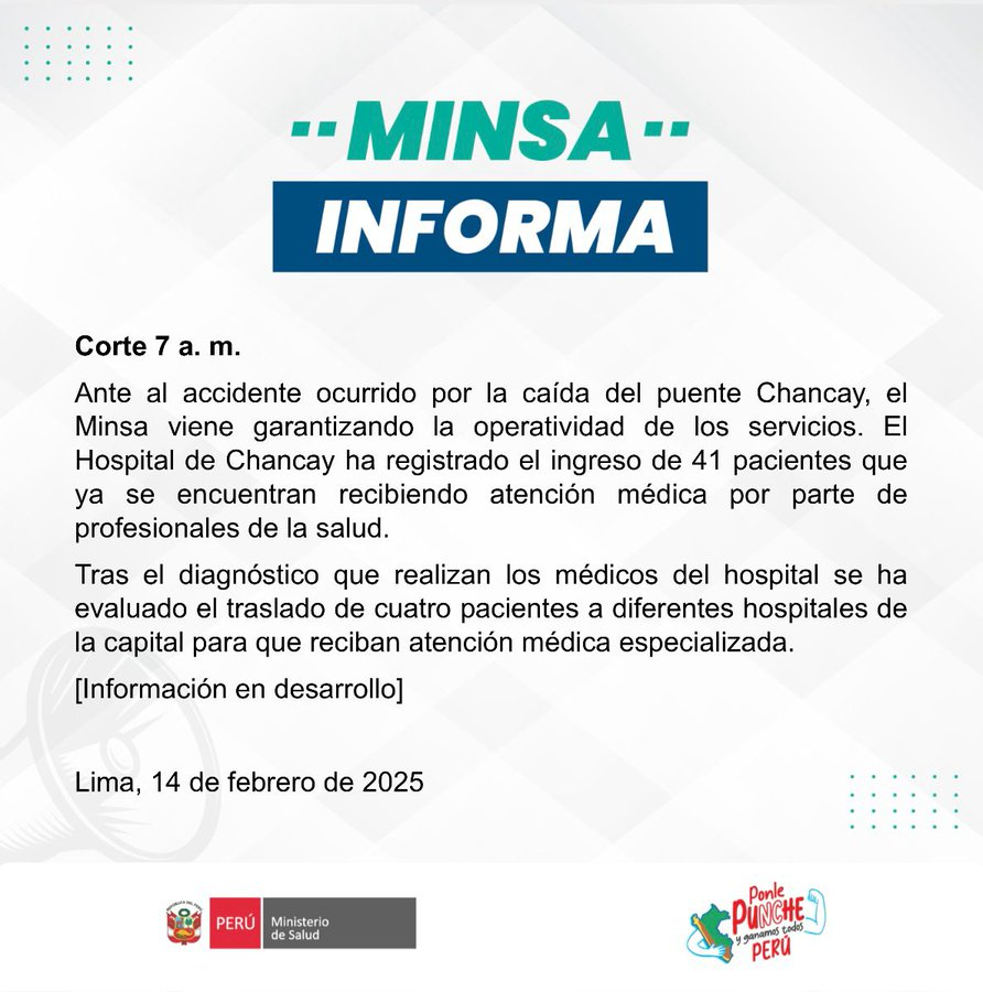 Mediante un comunicado, el Minsa agregó que se está evaluando la evacuación de 4 pacientes a diversos hospitales ubicados en la capital con la finalidad de que reciban atención especializada, de acuerdo a su estado de salud.