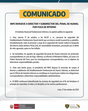 El Instituto Nacional Penitenciario (INPE) informó que se dispuso la remoción de sus cargos del director y subdirector del Establecimiento Penitenciario de Huaral tras la fuga de un interno identificado como Dylan Jiménez Pérez (24), de nacionalidad venezolana, quien logró escapar del centro de reclusión en horas de la mañana de este viernes 17 de octubre.