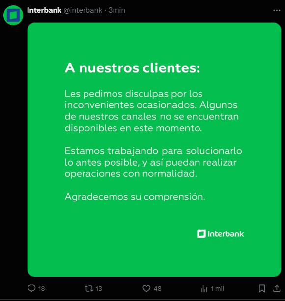 “A nuestros clientes: Les pedimos disculpas por los inconvenientes ocasionados. Algunos de nuestros canales no se encuentran disponibles en este momento. Estamos trabajando para solucionarlos lo antes posible, y así puedan realizar operaciones con normalidad”, se lee en el comunicado.
