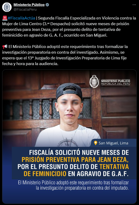 La mañana de este viernes 17 de enero, el Ministerio Público anunció en sus redes sociales que a través de la Segunda Fiscalía Especializada en Violencia contra la Mujer de Lima Centro se solicitó nueve meses de prisión preventiva para Jean Deza, por el presunto delito de tentativa de feminicidio en agravio de su expareja Gabriela Alava.