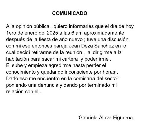 El parte policial también recoge que Deza abandonó el departamento poco después, bajo el pretexto de recoger unas llaves. Fue en ese momento cuando Gabriela Alava logró contactar a una amiga, quien la acompañó a la comisaría de Ciudad del Pescador, en el Callao, para formalizar la denuncia. La modelo presentó además fotografías como evidencia de las agresiones que sufrió.