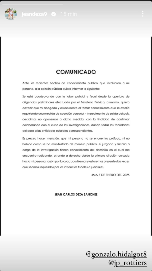 “Ante los recientes hechos de conocimiento público que involucran a mi persona, a la opinión pública quiero informar lo siguiente: Se está coadyuvando con la labor policial y fiscal desde la apertura de diligencias preliminares efectuada por el Ministerio Público, asimismo, quiero advertir que mi abogado y el recurrente al tomar conocimiento que se estaría requiriendo una medida de coerción personal – impedimento de salida del país, decidimos no oponemos a dicha medida, con la finalidad de continuar colaborando con el curso de las investigaciones, dando todas las facilidades del caso a las entidades estatales correspondientes”, se lee en el inicio del comunicado.
