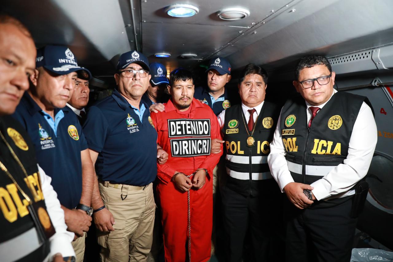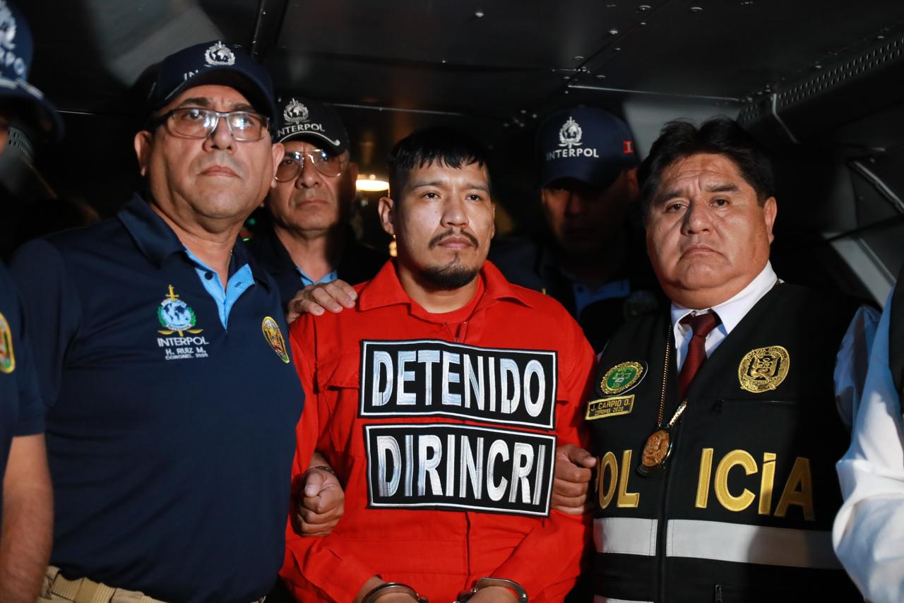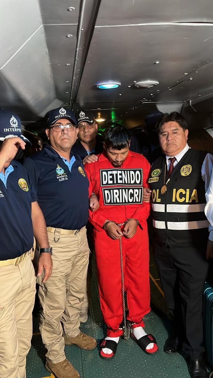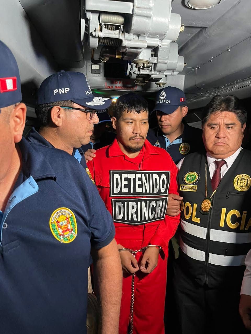 La Policía Nacional del Perú difundió imágenes de su llegada a Lima. Latina Noticias también pudo captarlo desde algunos minutos antes de descender enmarrocado del avión que lo trajo.