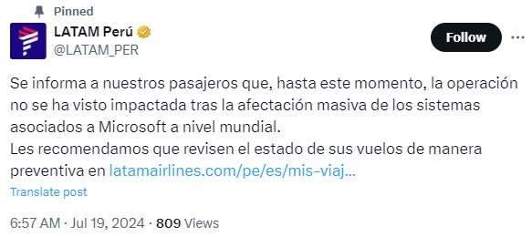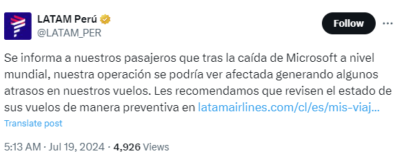 En otra publicación, Latam Perú informó que “hasta el momento, la operación no se ha visto impactada tras la afectación masiva de los sistemas asociados a Microsoft a nivel mundial”.