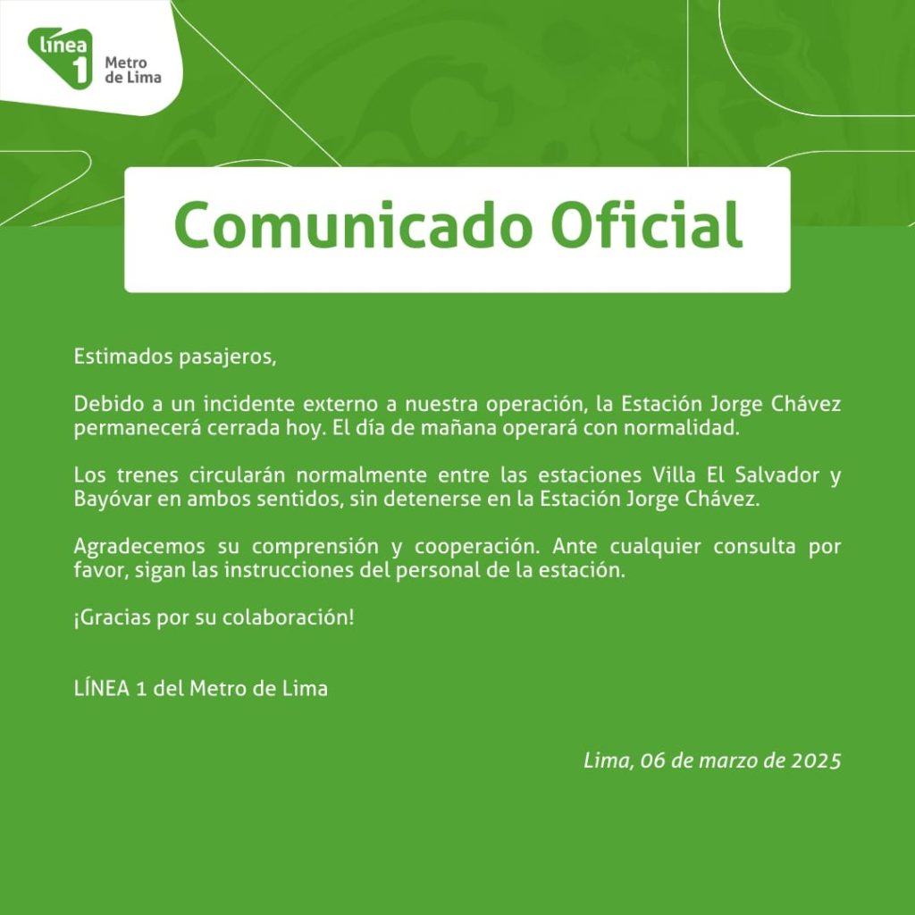 “Debido a un incidente externo a nuestra operación, la Estación Jorge Chávez permanecerá cerrada hoy. El día de mañana operará con normalidad.