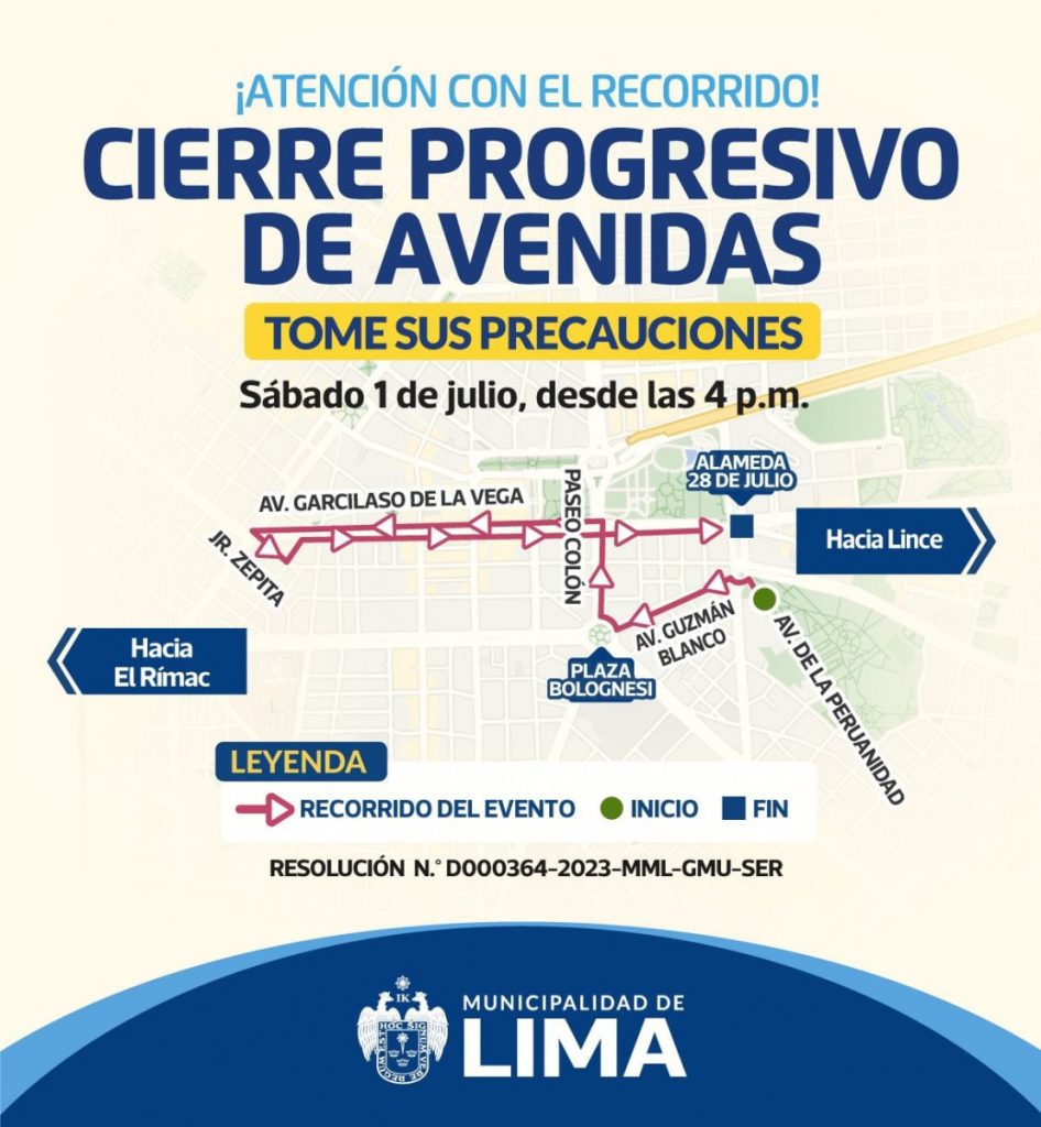 La Municipalidad Metropolitana de Lima (MML) anunció que a partir de las 4:00 p. m., se implementará una progresiva clausura de los carriles en las avenidas La Peruanidad, Guzmán Blanco, 9 de Diciembre, Garcilaso de la Vega, Tacna y Jr. Zepita, con el propósito de facilitar la realización de la “XXI Marcha del Orgullo LGTBI+ en Lima”.