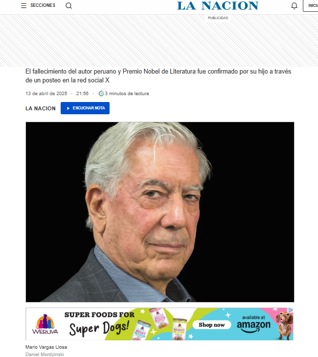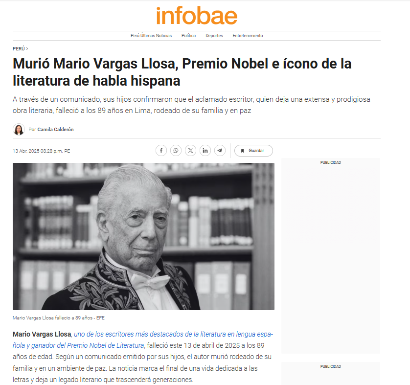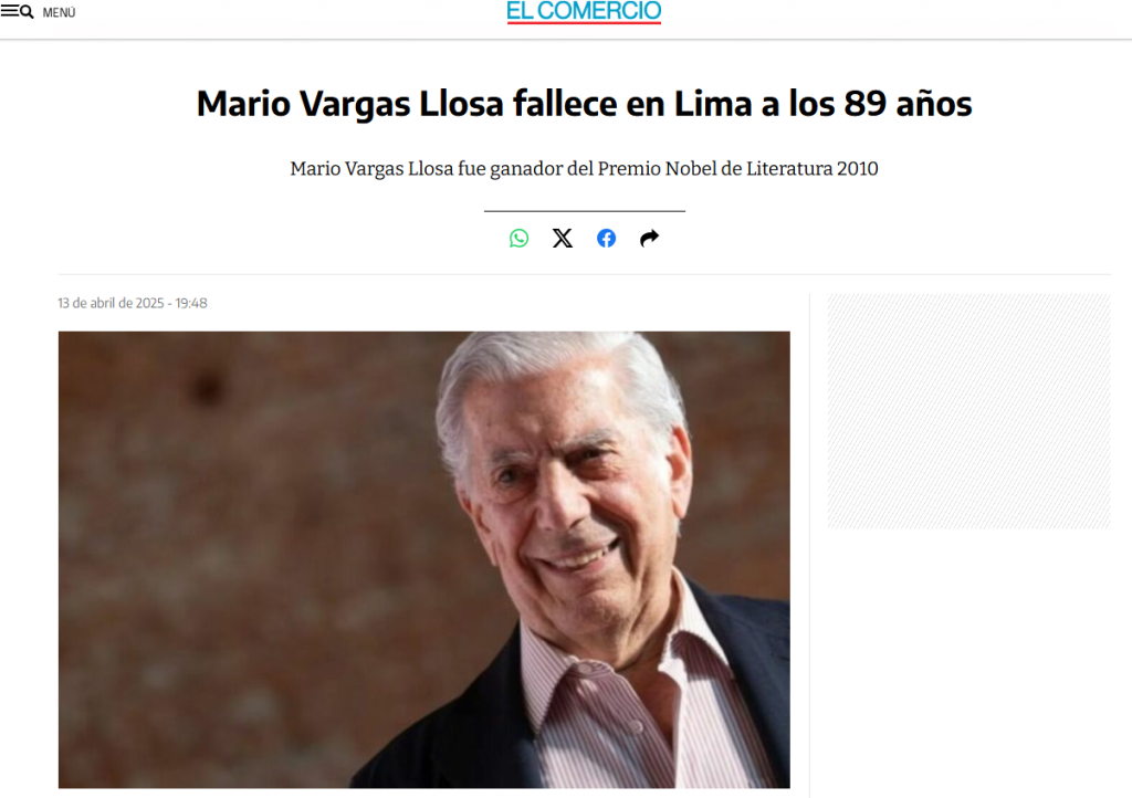 “Mario Vargas Llosa fallece en Lima a los 89 años”, indicó el diario El Comercio