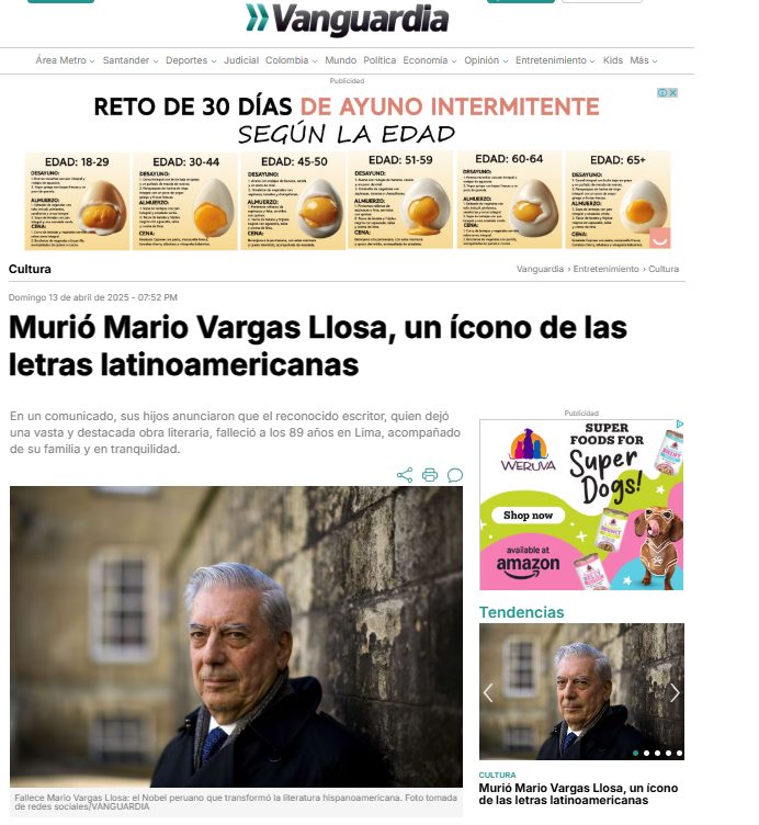 “Murió Mario Vargas Llosa, un ícono de las letras latinoamericanas”, tituló Vanguardia.