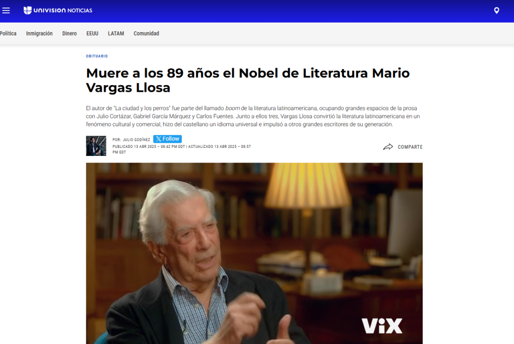 “Muere a los 89 años el Nobel de Literatura Mario Vargas Llosa”, detalló Univisión.