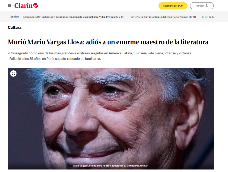 “Murió Mario Vargas Llosa: adiós a un enorme maestro de la literatura”, dijo Clarín.