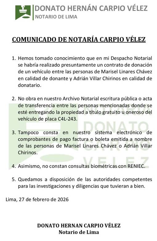 Mediante sus redes sociales, la Notaría Carpio Vélez, a cargo del notario Donato Hernán Carpio Vélez, señaló que “hemos tomado conocimiento que en mi Despacho Notarial se habría realizado un contrato de donación de un vehículo entre Marisel Linares en calidad de donante y Adrián Villar en calidad de donatario”.