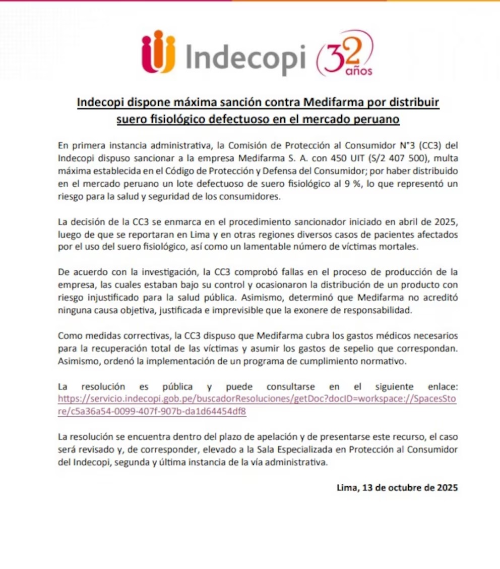 El Instituto Nacional de Defensa de la Competencia y de la Protección de la Propiedad Intelectual (Indecopi), multó con más de 2.4 millones de soles a la empresa Medifarma S.A. por haber distribuido un lote de suero fisiológico defectuoso al 9&. Dicha multa es la sanción máxima por parte de Indecopi.