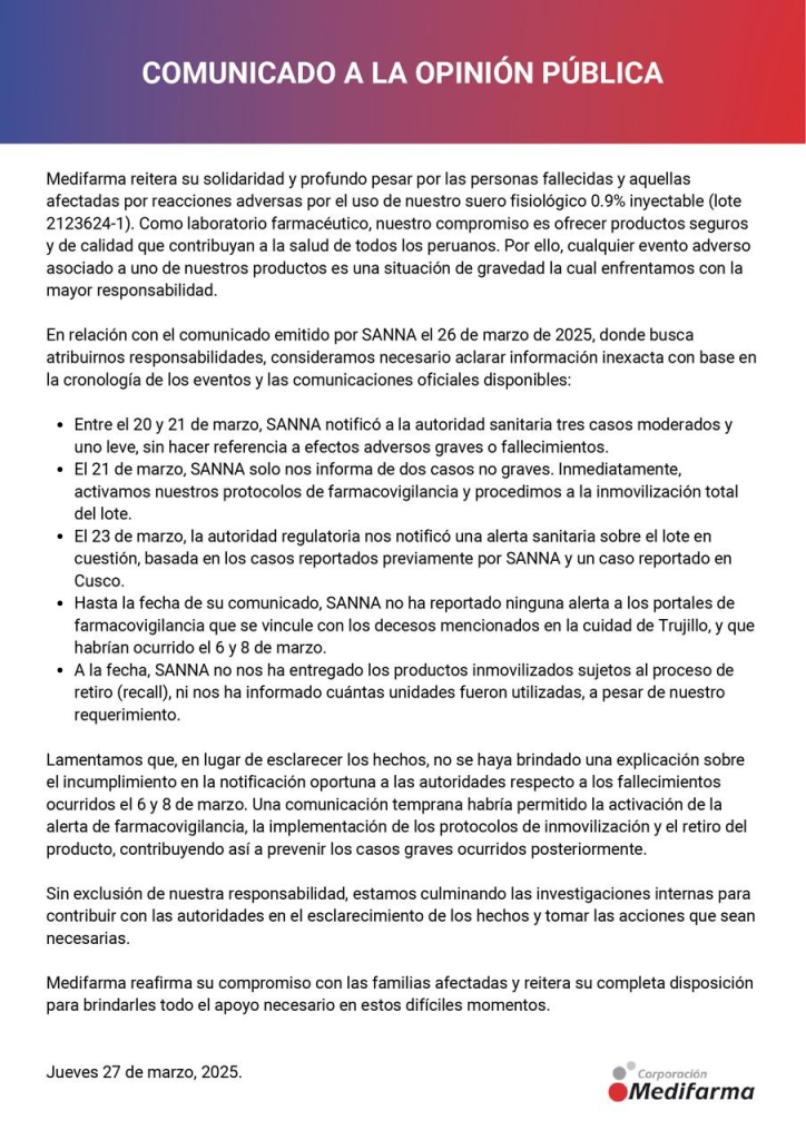 Después de la comunicación emitida por la red de clínicas Sanna, Medifarma hizo lo mismo y aseguró que el nosocomio “no reportó ninguna alerta a los portales de farmacovigilancia que se vincule con los decesos mencionados en la ciudad de Trujillo, y que habrían ocurrido el 6 y 8 de marzo”.