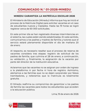 Horas después, el Minedu emitió un comunicado en el que reconoció las intermitencias del sistema y confirmó que, hasta las 7:00 p. m., se habían logrado registrar cerca de 60 mil solicitudes de matrícula. La entidad aseguró que los inconvenientes técnicos ya se encuentran en proceso de estabilización y que el servicio estará completamente operativo desde este martes 20 de enero.