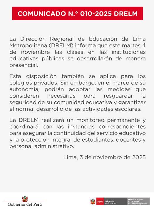 La Dirección Regional de Educación de Lima Metropolitana (DRELM), adscrita al Ministerio de Educación (Minedu), informó que este martes 4 de noviembre las clases en las instituciones educativas públicas se desarrollarán de manera presencial.