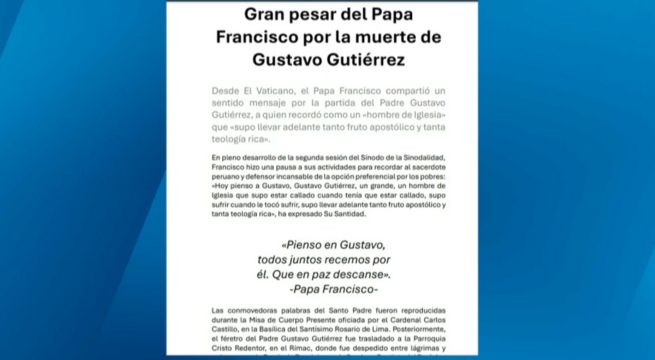 A través de una carta, el papa Francisco expresó su pesar por el fallecimiento de Gustavo Gutiérrez.