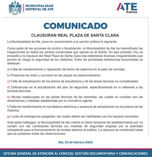 Este martes 25 de febrero, la Municipalidad de Ate anunció la clausura temporal del Real Plaza Santa Clara tras una exhaustiva inspección que reveló múltiples incumplimientos en las condiciones técnicas y medidas de seguridad al interior centro comercial. La decisión se tomó para salvaguardar la integridad de los visitantes y colaboradores del establecimiento.