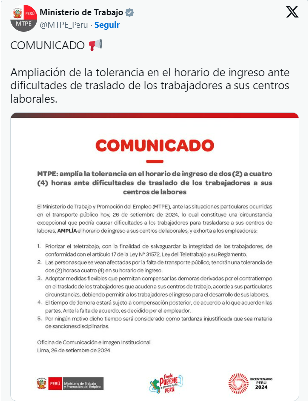 La mañana de este jueves 26 de septiembre, el Ministerio de Trabajo y Promoción del Empleo (MTPE) emitió un comunicado en el que informa que los trabajadores afectados por el paro de transportistas públicos tendrán dos horas de tolerancia para llegar al trabajo.