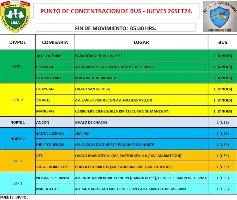 De acuerdo al general Javier Vela, jefe de Tránsito de la PNP, son 25 los buses que estarán disponibles en los puntos de concentración (comisarías) ubicados en los cono sur y norte, así como en el centro de Lima (Puente Nuevo).